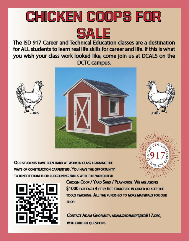 in my graphic design class we were assigned to create a flyer for some chicken coops that are being made by the students in construction trades at dctc. all of the information used on the flyer is main resources I was given and required to put on the flyer for the assignment.