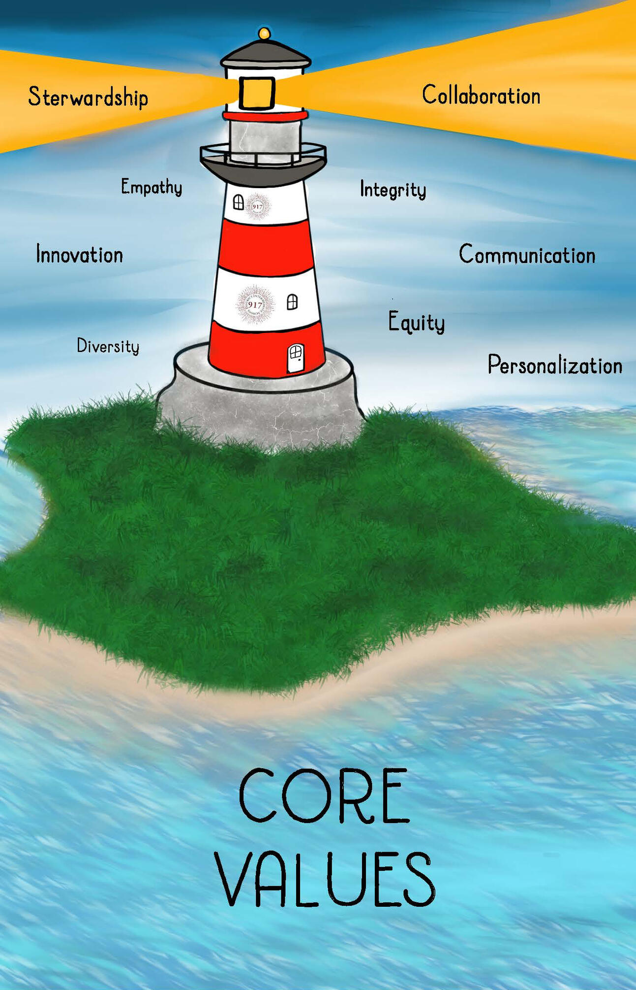my assignment was to create a poster for the isd 917 core values. my teacher said that the principal likes light houses a lot and that whole concept. so that's where I got the idea to make the base of the picture a lighthouse. I wanted it go look pretty realistic even with the words. I think the font goes pretty well with the water and background.