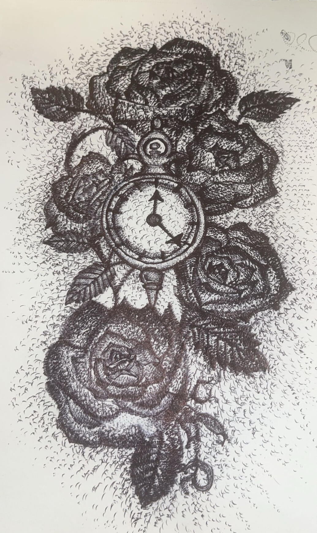 this is a tattoo design I created and its actually one I got tattooed on myself. I came up with the idea of doing something with roses because they are my favorite flower and also because rose is my middle name. the clock idea came from me looking at stuff to go with roses on Pinterest. I didn't want it to be too much so I kept it black and white.